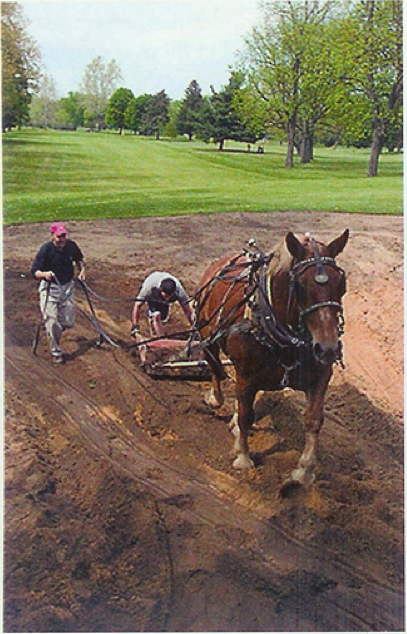 As happens often throughout the creative process, an idea that starts out as a lark will often become a fortunate set of circumstances. Such is the case when we decided to restore a few William Langford bunkers the old fashioned way — by using a couple of horses and a pair of antique wooden pull scrapers. Although this idea began as a nostalgic diversion, it evolved into a process that enabled us to understand the origins and forms of classic golf architecture more clearly.